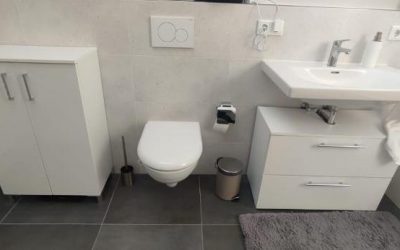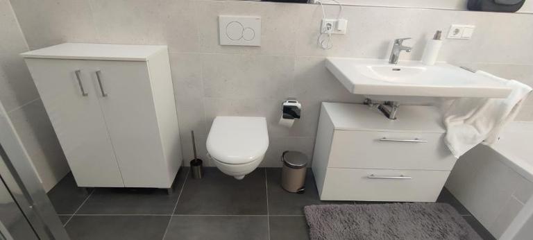 Fußbodenheizung, Bad mit Badewanne und Dusche.